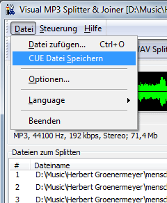 Wenn die Datei erfolgreich gespeichert wurde, können wir das Programm schließen. Information über die Teile geht nicht verloren. Wenn Sie später entscheiden die Datei doch zu schneiden, klicken Sie "Datei zufügen" an und öffnen Sie einfach die CUE Datei. Die Teile werden in der Splitliste angezeigt. Um die große Datei zu schneiden, klicken Sie "Splitten" an.